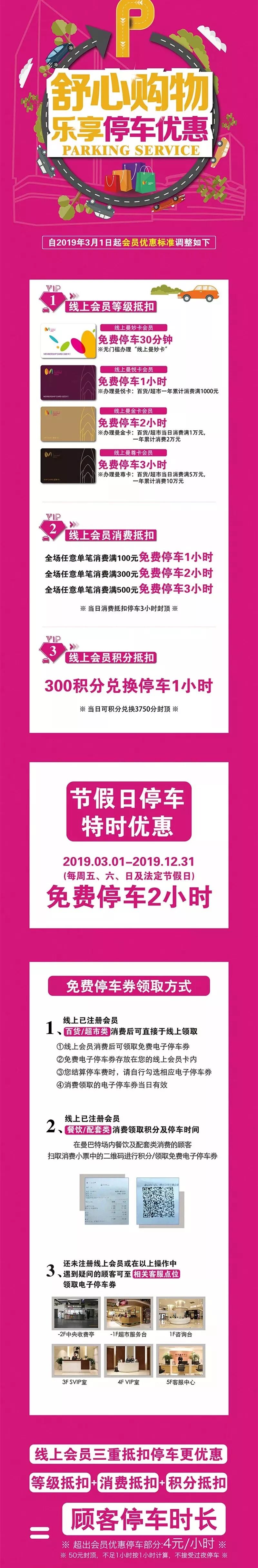今年3月1日起,曼巴特停车场免费停车时长有变动:无会员卡周一至周四15分钟内免费,周五至周日及法定假日2小时内免费;会员停车收费按等级抵扣。
